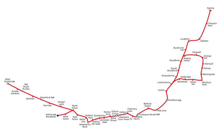 The Central line runs through central London, from Epping, Essex, in the north-east to Ealing Broadway and West Ruislip in the west. It is one of only two lines on the Underground network to cross the Greater London boundary, the other being the Metropolitan line.