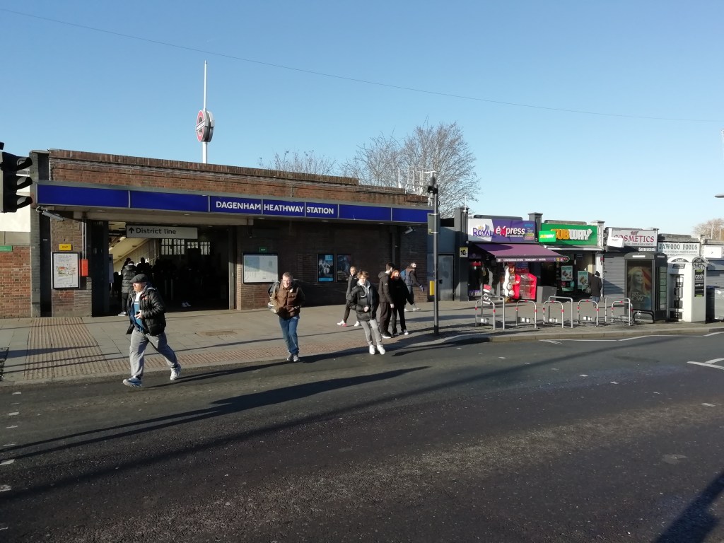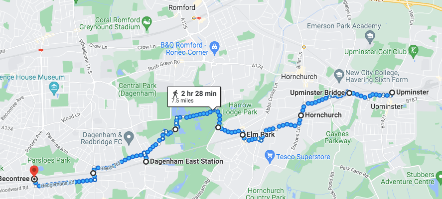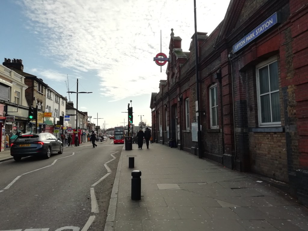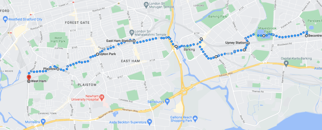 Upminster StationUpminster Bridge StationHornchurch StationElm Park StationDagenham East StationBy Harrow Lodge ParkDagenham Heathway StationBecontree StationMayesbrook ParkUpney StationRipple RoadDistrict Line at Ripple RoadBarkingBarking StationBarkingBetween Barking & Abbey QuayAbbey QuayNorth CircularNorth CircularNorth CircularEast Ham StationSwami Ayappa Temple in East HamMilton AvenueHarold RoadUpton Park StationGreen StreetPlaistow StationWest Ham Station