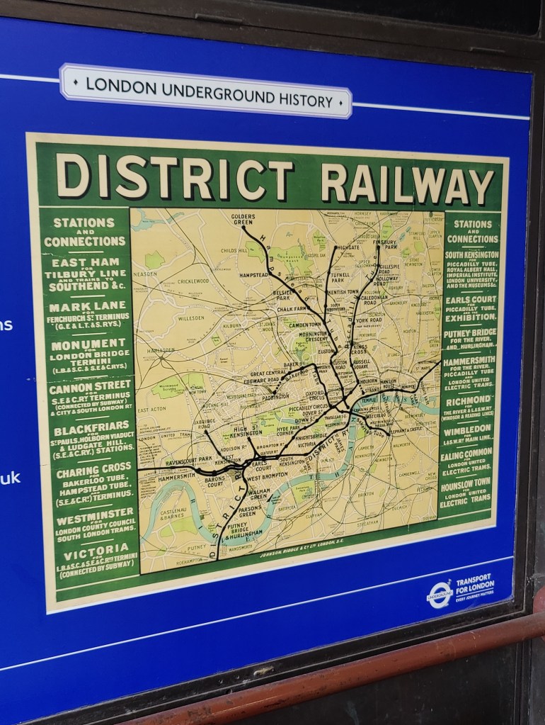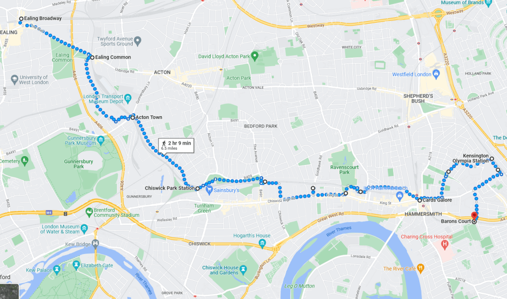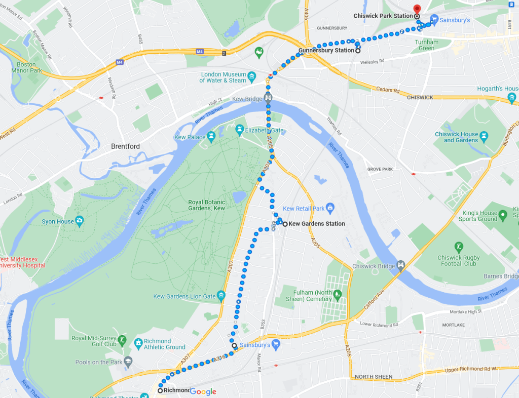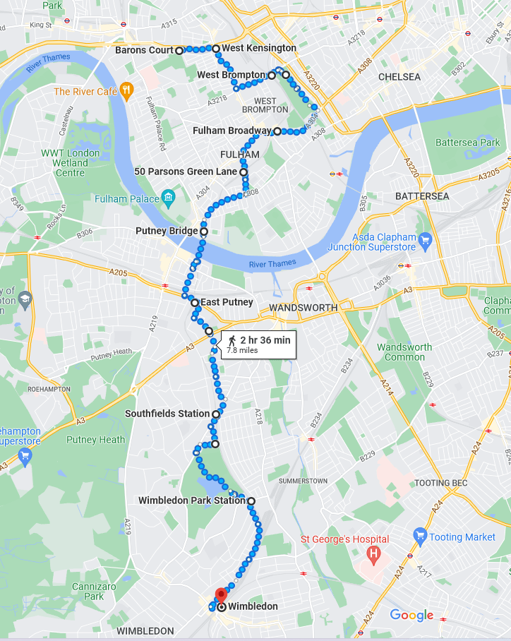 Richmond StationRichmondFood Market at Kew Gardens StationKew Gardens StationPub by Kew GreenKew GreenRiver Thames from Kew BridgeBrentford Community StadiumSouth Circular Road meets the M4 MotorwayChiswick RoundaboutGunnersbury StationChiswick Park StationOld Roundels Station Sign at Ealing Broadway (dating to 1915)Ealing Broadway StationEaling BroadwayEaling Common StationCrossing the Piccadilly Line at Tring AvenueStreet Party at Carberry AvenueActon Town Station, Gunnersbury Lane EntranceOld District Railway Map at Acton Town StationActon Town Station, Bollo Lane Entrance Chiswick Park Station (again)Acton Green CommonTurnham Green Station Hotel on Bath LanePrebend GardensStamford Brook StationRavenscourt Park StationVCRs on King Street, Hammersmith. Hammersmith StationBrook Green Kensington (Olympia) StationOlympiaOlympiaSt Paul’s Studios on Talgarth RoadBaron’s Court StationBaron’s CourtWest Kensington StationThe “Talgarth Road Flat” from the film TrainsporttingThe Empress State BuildingBrymay Matches Ghost Sign at 26 Lillie RoadUdderbelly Festival & The Empress State building from Lillie RoadWest Brompton StationBrompton CemeteryBrompton CemeteryStreet Party on Billing RoadStamford BridgeFulham Broadway Stamford BridgeFulham Broadway StationParsons Green StationPutney Bridge StationFulham Railway BridgeRiver Thames from Fulham Railway BridgeFulham Railway BridgeStreet Party on Disraeli RoadCrossing The SWR Line, with District Line in the Background, at Oxford RoadEast Putney StationStreet Party on Gressenhall Road & Melrose RoadSouthfields StationWimbledon ParkWimbledon Park StationWimbledon Station