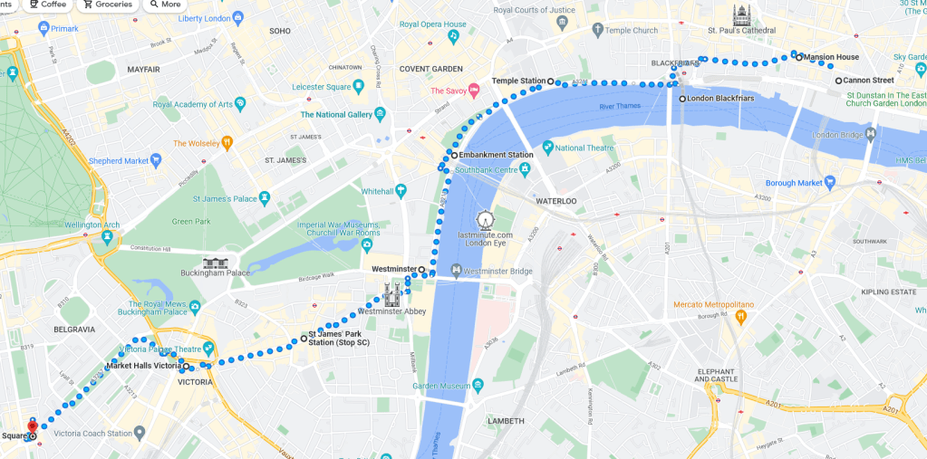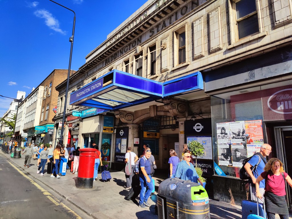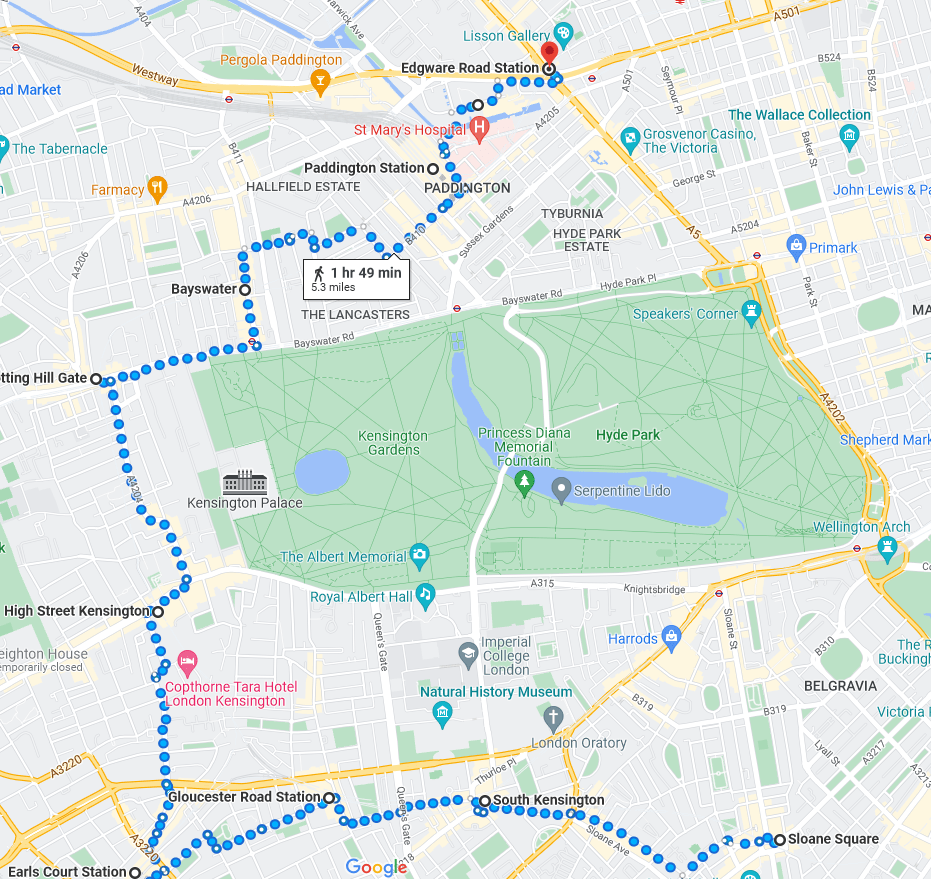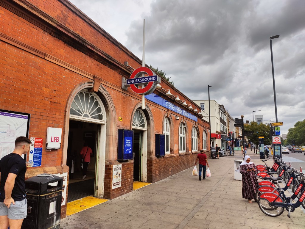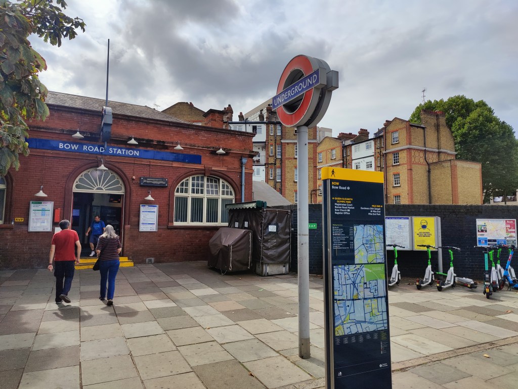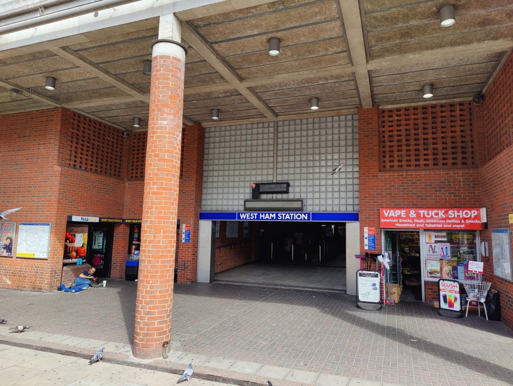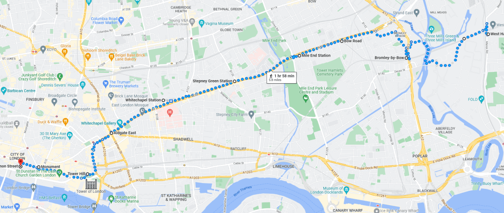West Ham Station, with a change in shops outside since we visited in JanuaryThe Greenway in West HamChannelsea River in West HamThe ArcelorMittal Orbit from The GreenwayRiver Weir from The GreenwayCoffin by a houseboat on the River LeaBy the River LeaBy the River LeaBromley-by-Bow StationBow Road StationMile End StationRegent’s Canal at Mile EndMile End RoadStepney Green StationThe New Royal London Hospital (with the old hospital building now Tower Hamlets Town Hall)Whitechapel Station – the only bi-lingual station sign on the tube netwok (English & Bengali)Aldgate East StationCity Parking – Fenchurch StreetTower Hill StationMonument StationCannon Street StationMansion House StationBlackfriars StationOn The Victoria EmbankmentTemple StationEmbankment StationOn The Embankment towards Parliament BridgeWestminster StationBig Ben & The Houses of ParliamentParliament SquareSt James’ Park StationVictoriaVictoria StationSloane Square StationSloane SquareSouth Kensington StationGloucester Road StationEarls Court StationHigh Street Kensington StationPremium Housing Stock at Brunswick Gardens, KensingtonNotting Hill Gate StationBayswater StationPaddington Station. Perhaps the least attractive street in Central London.End of the line; Edgware Road Station