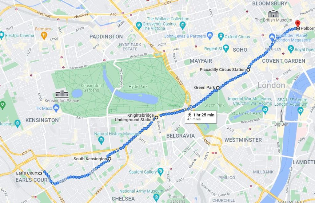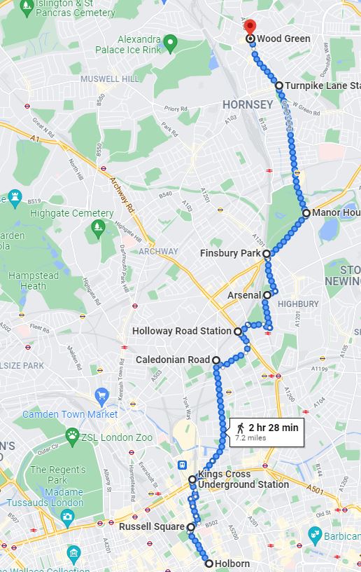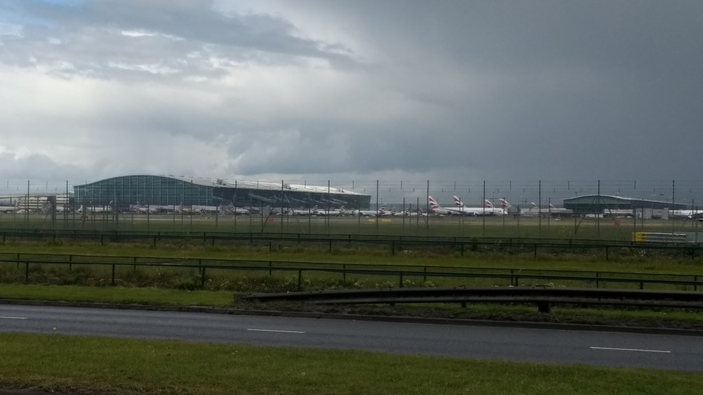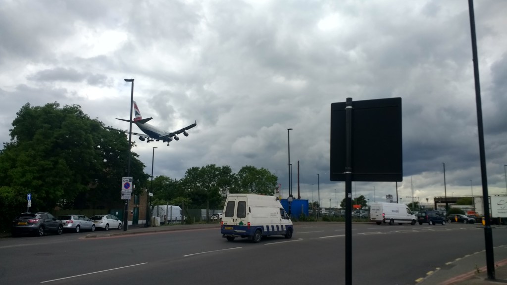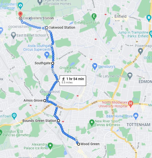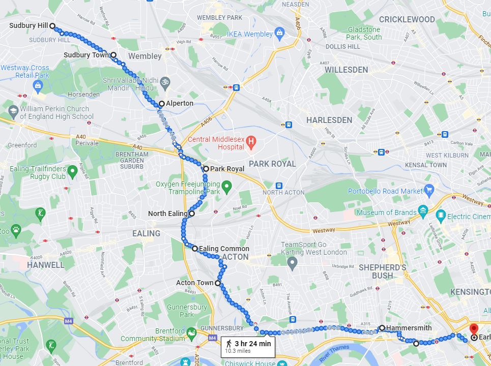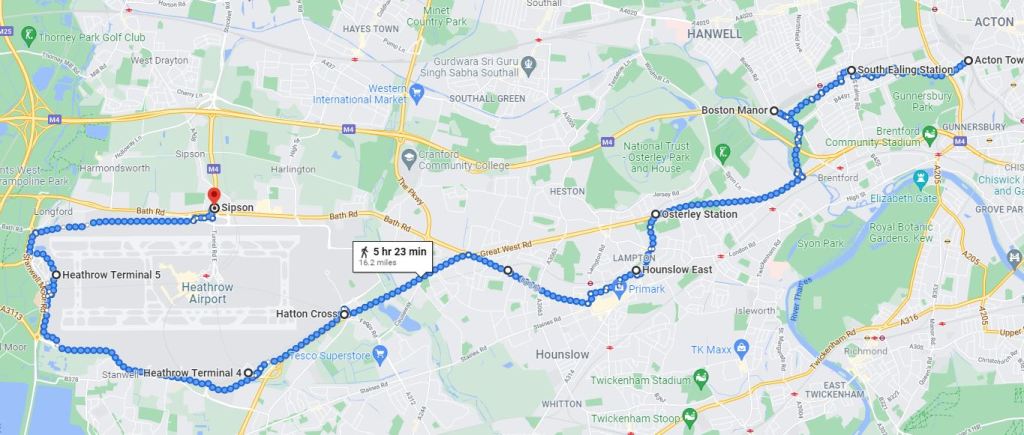 The area between the Emirates Roundabout at Sipson and Heathrow Terminals 1,2 & 3 Station is the only section of the London Underground Network it is not possible to walk. This was done by bus (approx 0.5 miles)