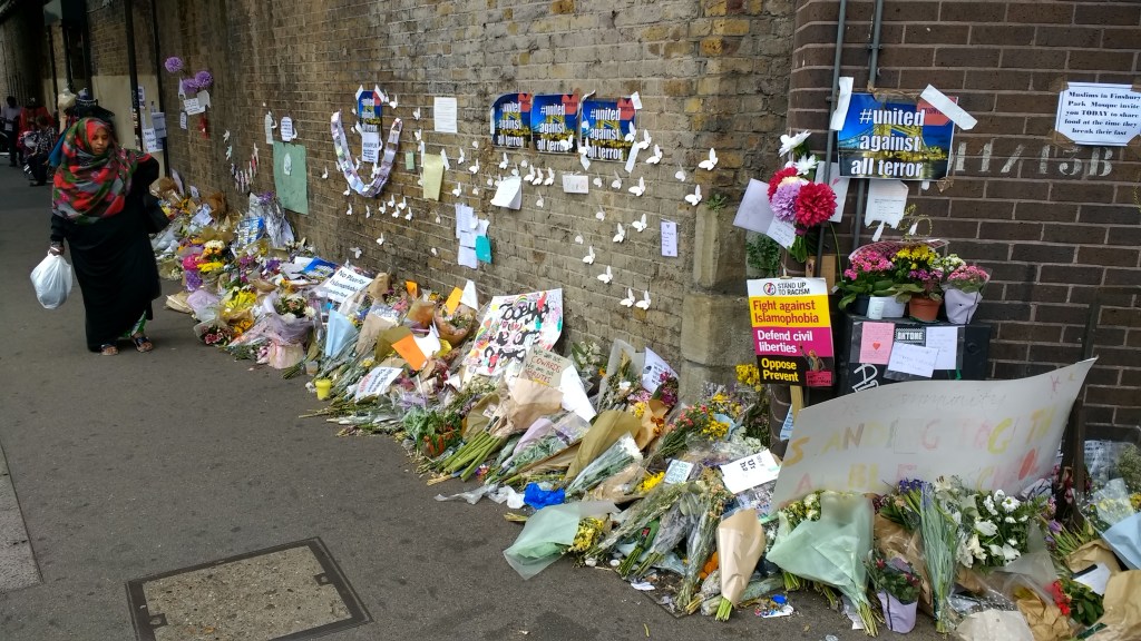 Flowers outside Finsbury Park Mosque following the June 19th Terrorist Attack